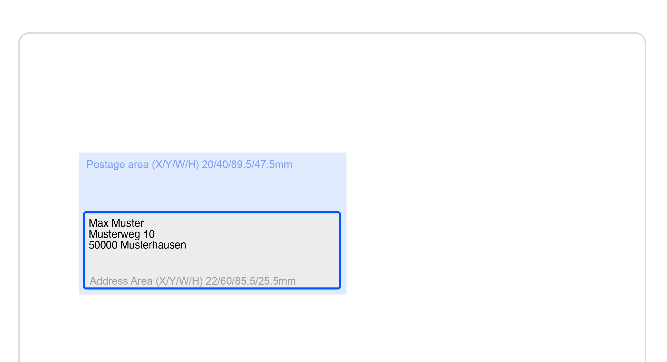 Der Frankierbereich muss für die Frankierung der Post freigelassen werden. Der folgende Bereich auf der 1. Seite darf keine Inhalte enthalten:Für Briefumschläge mit Fenster links: