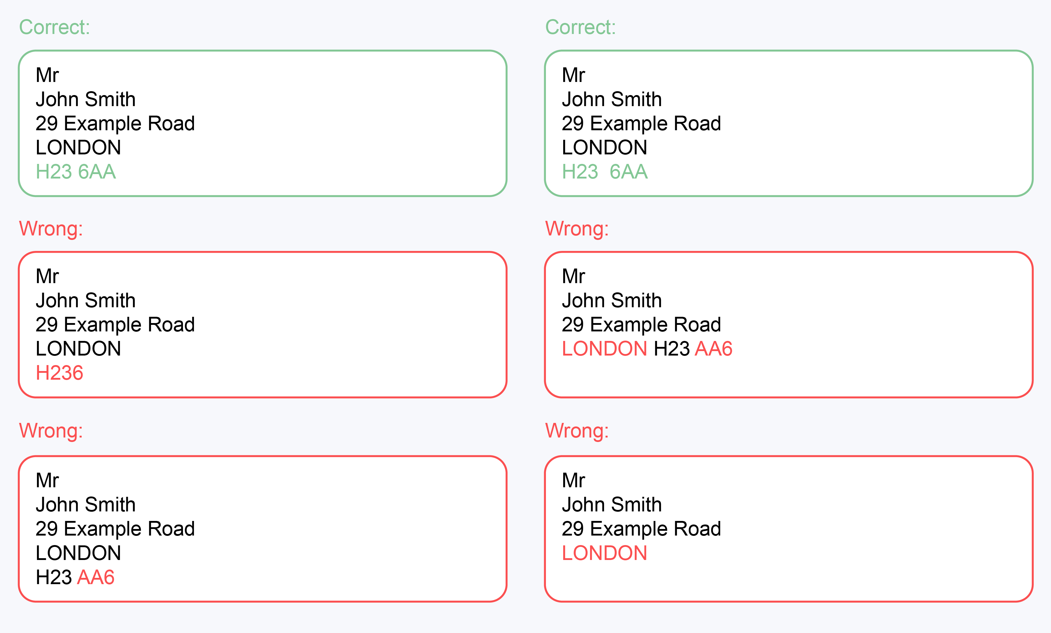 Veuillez vous assurer que le code postal est écrit en majuscules et qu'il est correctement séparé. Par exemple, H23 6AA ou H23 6AA (et non « h23 6aa » ou « H236AA »).