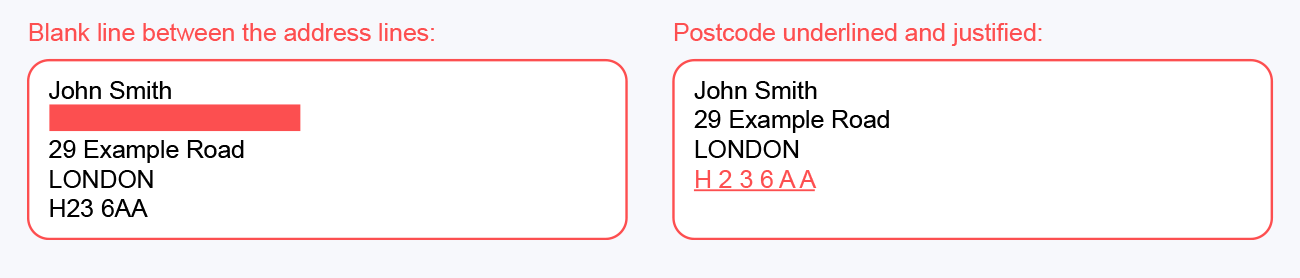 Les lettres à destination du Royaume-Uni une fois imprimées, sont transmises à Royal Mail pour distribution. À partir de ce moment, la responsabilité ultérieure incombe à Royal Mail. Pour que vos lettres puissent être traitées sans problème et aux prix convenus par Royal Mail, il est important que les adresses des destinataires respectent des exigences spécifiques.